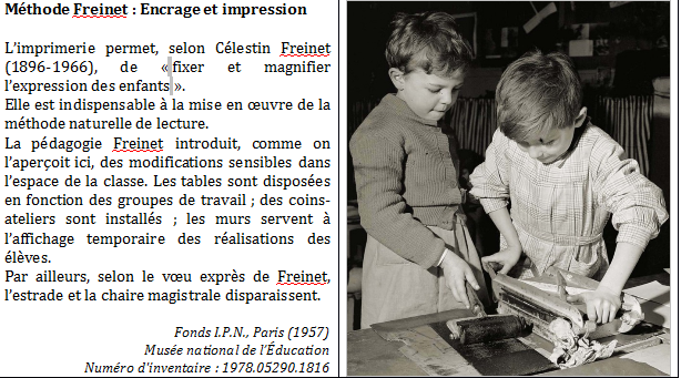 L’organisation de l’espace de la classe des tables (disposées en fonction des groupes de travail, coins-ateliers), l’affichage des réalisations des élèves, etc. apparaissent comme des normes de fonctionnement. Toutefois, ces méthodes pédagogiques doivent être reliées à un nouveau regard sur l’élève, à un idéal, une nouvelle vision de l’enfant et de sa destinée.