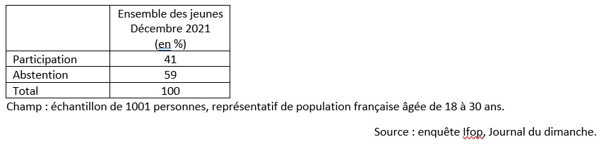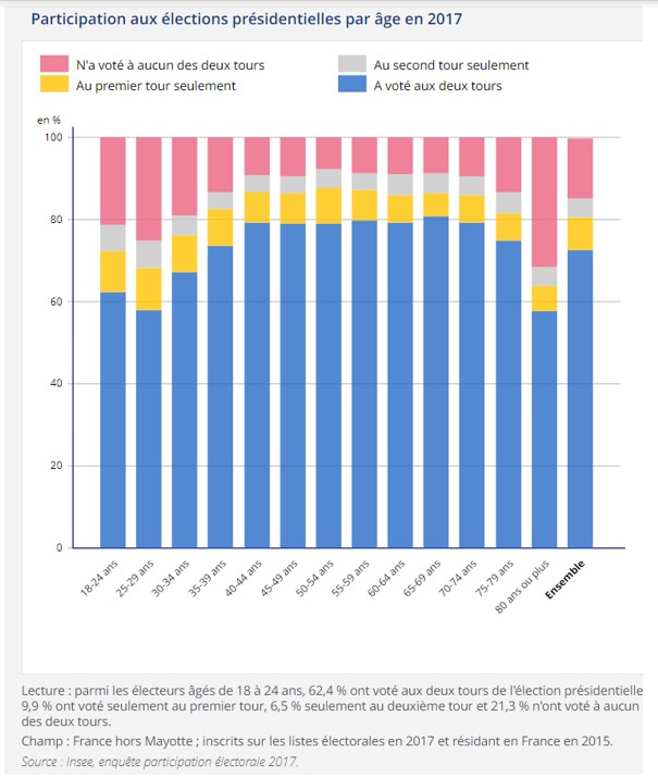 En France en 2017, selon l’insee, sur 100 jeunes âgés de 18 à 24 ans inscrits sur les listes électorales,62 ont voté aux deux tours des élections présidentielles, 11 ont voté seulement au 1er tour, 6 ont voté seulement au 2nd tour et 21 n’ont voté ni au premier ni au second tour.