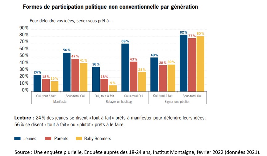 Par exemple, sur 100 jeunes, 56 sont prêts à manifester alors que sur 100 baby-boomers, 41 sont prêts à le faire.