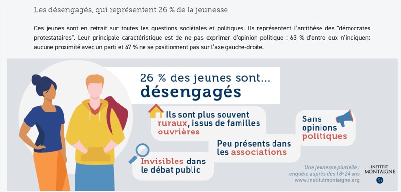 Source : Ariane Ferrand, Loin des élections, la jeunesse en quête de nouvelles formes d’engagement, Le Monde, 10/09/21.