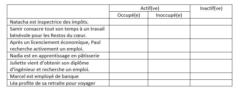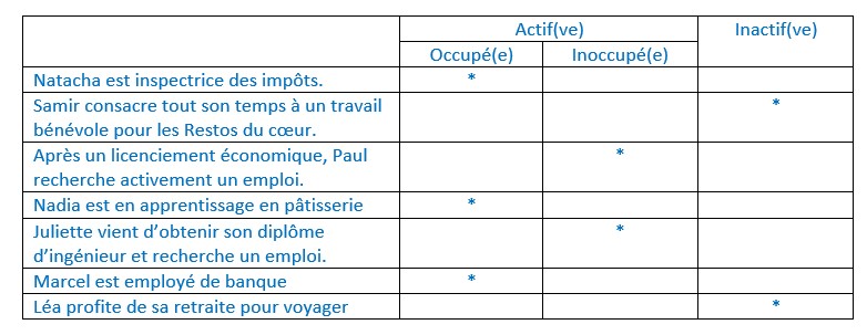 Un emploi est un travail rémunéré. On peut classer les individus selon leur situation face à l’emploi. On distingue ainsi les actifs des …………………….. Les actifs sont les individus qui occupent un emploi ou qui en recherchent un, tandis que les inactifs sont sans emploi et n’en cherchent pas. Les inactifs sont par exemple les étudiants, les chômeurs découragés, les retraités ou les hommes ou femmes au foyer. Parmi les actifs, ceux occupant un emploi sont appelés ……………………………… et ceux sans emploi mais qui en cherchent un sont les ……………………………………….. ou chômeurs.