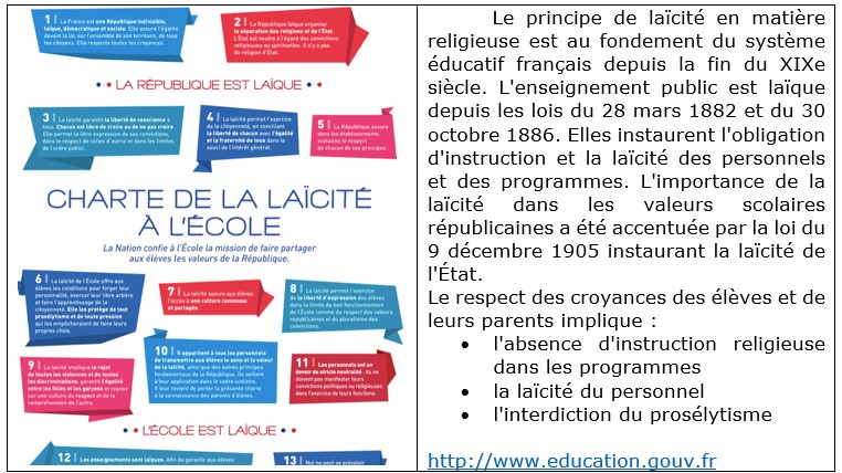 La laïcité suppose l'absence d'instruction religieuse dans les programmes, la laïcité du personnel et l'interdiction du prosélytisme.