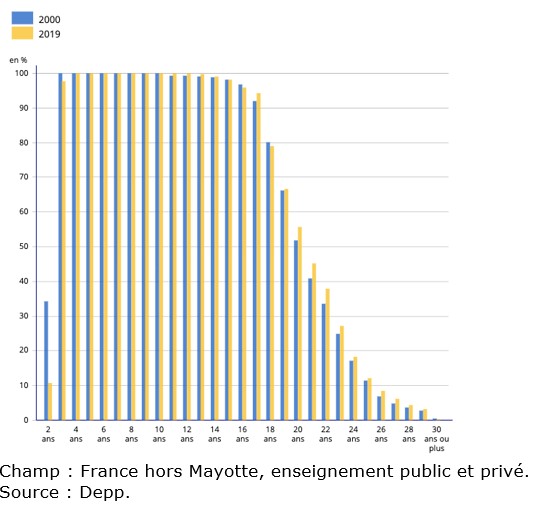 Selon le Ministère de l’Éducation nationale (DEPP), le taux de scolarisation des enfants de 2 ans en France est de 11% en 2019. A partir de 4 ans, il est de 100%. Tous les enfants doivent être scolarisés. Il diminue légèrement à partir de 10 ans (98,6%) puis nettement à partir de 16 ans (94%). Seule la moitié des jeunes de 20 ans sont scolarisés, généralement dans des établissements universitaires. En France, les étudiants de plus de 25 ans forment moins de 10% des jeunes.