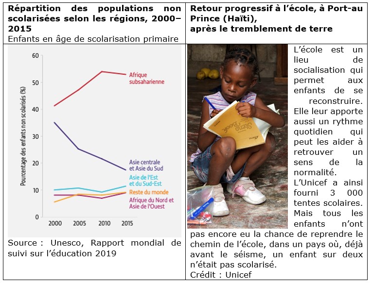 Les taux de scolarisation sont les plus faibles en Afrique subsaharienne et dans quelques pays d’Asie du sud-est.