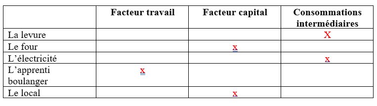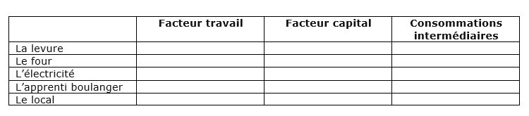 4) Travail, capital ou consommations intermédiaires ? Nous sommes chez un pâtissier Cochez la bonne réponse pour chaque élément proposé.