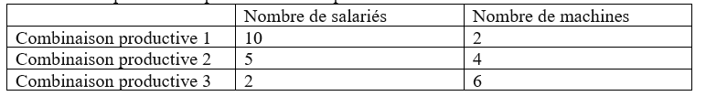 Par exemple quand on passe de la combinaison productive 1 à la combinaison productive 2 on remplace l’homme par la machine, on substitue du capital au travail. La combinaison 2 utilise 5 salariés en moins et deux machines en plus.