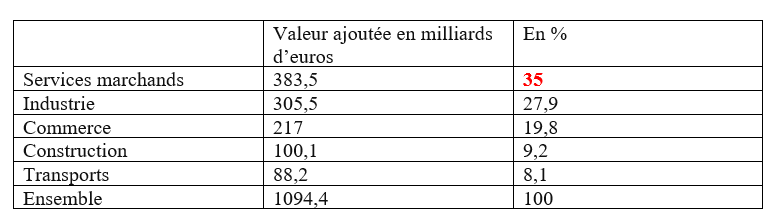 Part de la valeur ajoutée réalisée par les services marchands = 100 – 27,9-19,8-9,2-8,1 = 35% ou (383,5/1094,4) x 100