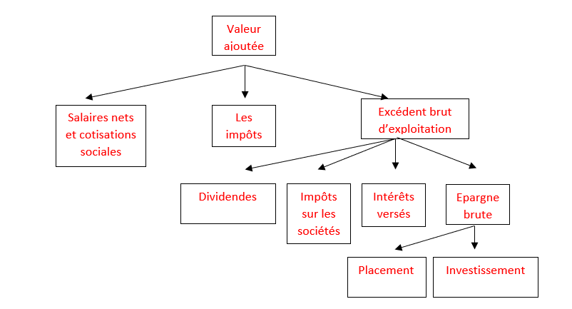 La valeur ajoutée permet de rémunérer l’ensemble des agents ayant participé directement ou indirectement à la production : les salariés d’une part, qui contribuent directement à la création de richesses et perçoivent une rémunération sous forme de salaires nets et de cotisations sociales, l’Etat d’autre part qui perçoit les impôts liés à la production. Le reste rémunère l’entreprise et représente l’excédent brut d’exploitation (E.B.E.), c'est-à-dire le profit de celle-ci.
