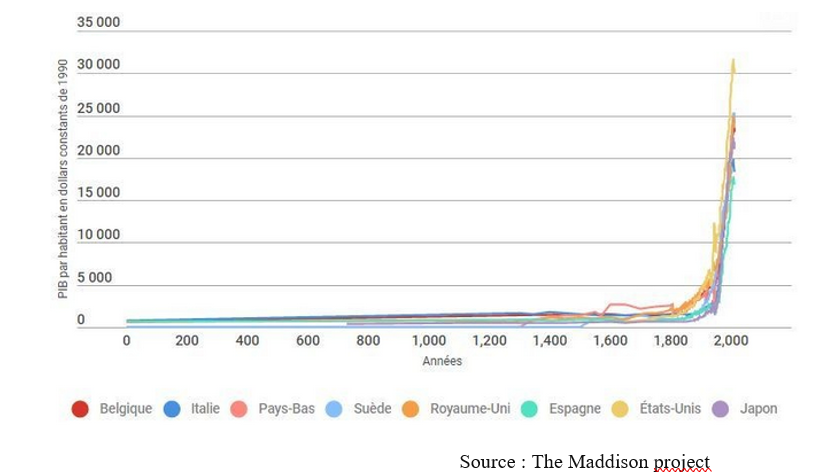 La hausse du PIB par habitant fait suite à la révolution industrielle qui débute en Angleterre à la fin du 18éme siècle.