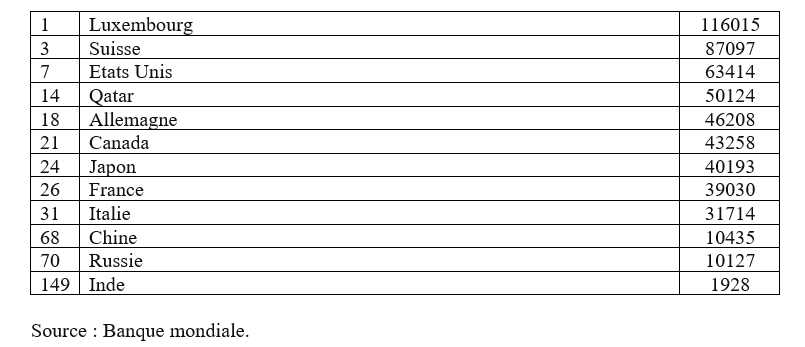 Le niveau de vie au Luxembourg est 1,8 fois plus élevé que le niveau de vie aux Etats-Unis, trois fois plus élevé que le niveau de vie en France et 60 fois plus élevé que le niveau de vie en Inde
