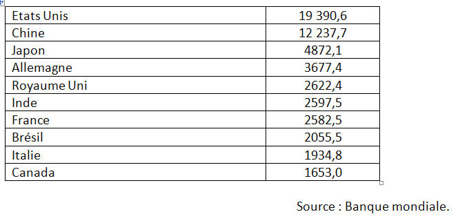 Document 2 : Le top 10 des PIB en 2020 en milliards de dollars courants