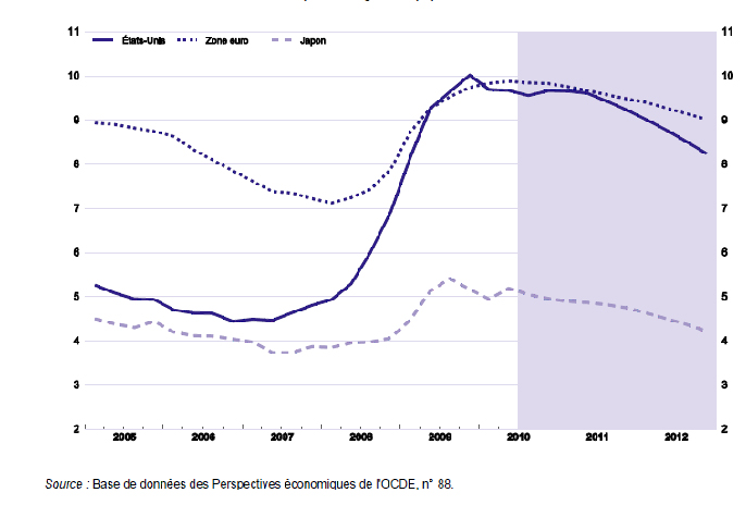 En 2010, la très forte dégradation du marché du travail exacerbait encore les inquiétudes des ménages, dans une situation déjà tendue financièrement, tandis qu’une reprise tirée par l’investissement des entreprises semblait exclue (baisse de 15 % en 2009) face à l’érosion des perspectives de profits. Les politiques conjoncturelles (monétaire et budgétaire), massivement mobilisées afin de sortir le pays de la crise, devaient laisser la place à un ajustement durable afin de contenir le creusement des déficits et le gonflement de la dette publique : cette stabilisation conjoncturelle devait freiner durablement l’activité, voire asphyxier la reprise et générer un « double dip », soit un second accès de faiblesse après la crise. Malgré les nombreux désaccords politiques entre le parti du président et les républicains, le Congrès vient d’adopter un plan de réductions d’impôts (qui prolonge le plan de relance et de réinvestissement de l’administration Bush de février 2009) qui devrait gonfler le revenu disponible des ménages (diminution des prélèvements) et compenser le blocage de l’immobilier résidentiel. Ce plan représente plus de 850 milliards de dollars injectés dans l’économie sur deux années, soit davantage que le plan de relance précédent.