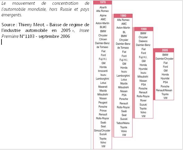 Le maintien des acteurs historiques de ce marché (qu’il s’agisse de Renault ou même des « Big Three » américains soit GM, Ford et Chrysler) dans cet univers concurrentiel a dû passer par un processus de concentration horizontale permettant de multiplier les plates-formes communes à plusieurs modèles (moteurs et carrosseries) et de parvenir à une taille critique en réalisant des économies d’échelle. Précisément, son isolement (sans compter l’alliance limitée avec General Motors) est généralement ce qui justifie les plus grandes difficultés actuelles de PSA. « L'Europe compte quarante constructeurs ; d'ici dix ans, il n'en restera qu'une poignée», cette phrase de Giovanni AGNELLI, alors PDG de Fiat, prononcée au début des années 1970, sonne comme une prédiction. Les dix premiers groupes contrôlent aujourd'hui 80 % de la production mondiale.