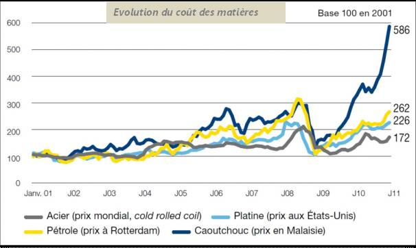 Mais si les Européens restent leaders, la production de voitures européennes se fait de moins en moins en Europe occidentale ! Les FMN l’ont très largement déplacée vers les pays qui permettent d’assurer un coût du travail moindre ou vers les marchés en croissance. Ainsi, la décomposition internationale des processus productifs s’avère très avancée pour les groupes généralistes qui, en moyenne, ne fabriquent pas plus de 30 % de leurs véhicules sur leur territoire d’origine. Plus précisément, le ratio production nationale/production mondiale est de 23 % pour le groupe Renault, 31 % pour Volkswagen, 33 % pour Fiat, 38 % pour PSA. Seules les marques centrées sur le haut-de-gamme, BMW et Daimler Benz, maintiennent plus de 60 % de leur production en Allemagne2. Précisons d’ailleurs que les constructeurs eux-mêmes ne sont à l’origine que d’un quart de la production totale en moyenne, tant la sous-traitance et le recours à d’autres entreprises est élevée. La hausse des coûts de production a joué un rôle majeur dans cette tendance. Comme l’indique le graphique suivant, il s’agit d’abord d’une hausse du prix des matières premières : le prix du caoutchouc, par exemple, a été multiplié par 6 depuis 2001, permettant de mieux comprendre la logique de rationalisation entamée par Michelin et annoncée il y a peu3.