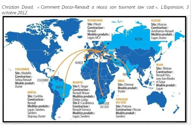 On sait que Renault a suivi cette tendance avec la création réussie d’une gamme de véhicules low cost à partir du rachat de l’entreprise publique roumaine Dacia en 1999. Mais, comme dans de nombreuses situations, les bas salaires ne sont pas ici suffisants : la production des Logans ou Dusters est assemblée dans l’ensemble du monde, de Tanger à Medellin à partir de pièces essentiellement fabriquées dans les usines roumaines de Pitesti. La volonté de gagner les marchés « de masse » situés dans les pays émergents a accompagné la stratégie de rationalisation des coûts.