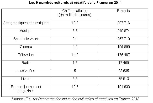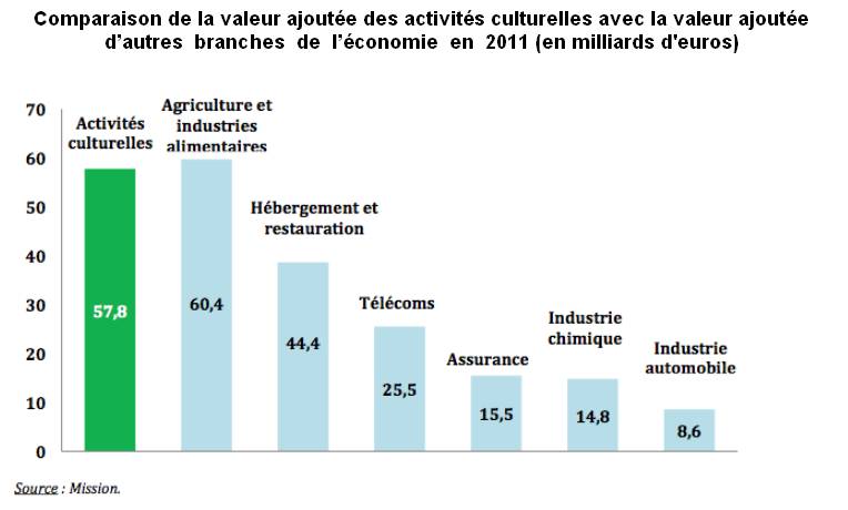 Déjà, en novembre 2012, le rapport de Louis Gallois sur la compétitivité industrielle de la France classait l'industrie culturelle comme l'un des « pôles d'excellence mondiaux de notre pays ». La France possède en effet des acteurs d'envergure mondiale et de tout premier plan : c'est le cas notamment de Vivendi, leader de la production et de l'édition musicale, de Deezer très bien positionné sur le marché de l'écoute musicale en ligne ou encore du groupe d'édition Hachette (2ème au niveau mondial), sans oublier le cinéma français, troisième producteur et deuxième exportateur au monde. Alors que la balance commerciale française accuse le plus lourd déficit de la zone euro, celle de l'industrie culturelle hexagonale était excédentaire de plus de 300 millions d'euros en 2011. Selon de nombreux analystes, l’investissement dans les industries culturelles doit permettre d’assurer la transition numérique et l'ouverture à l'international. La production culturelle s’élève en 2011 à 129,8 milliards d’euros, ce qui inclut la production marchande et la production non marchande, c’est-à-dire les services fournis (notamment par les administrations) gratuitement ou à un prix de vente inférieur à 50 % des coûts de production. La production dite non marchande se concentre dans les secteurs où l’intervention publique est forte, soit le spectacle vivant (10 milliards d’euros), le patrimoine (2 milliards d’euros) et l’accès aux savoirs et à la culture (2 milliards d’euros).