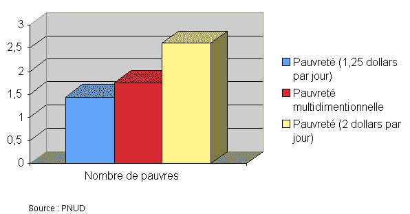 L'IPM nous renseigne ainsi à la fois sur le nombre moyen de personnes pauvres et sur les manques auxquels les ménages pauvres sont confrontés. Selon le PNUD, c’est ainsi 1,75 milliard de personnes, répartis dans les 104 pays en développement, qui souffrent de pauvreté multidimensionnelle. C’est donc un tiers de la population des pays en développement qui subit des privations multiples en matière de santé, d'éducation et de niveau de vie.