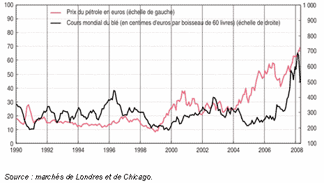 Graphique 3 : Évolution du prix mondial du pétrole et du blé depuis 1990