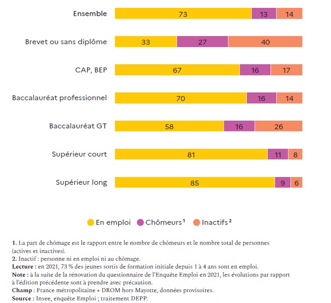 Situation d’activité des jeunes sortis de formation initiale depuis 1 à 4 ans, selon le diplôme, en 2021 (en%)