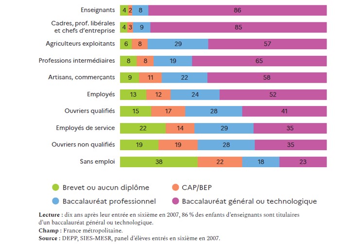 Si les inégalités sociales d’accès au baccalauréat en fonction de l’origine sociale se sont réduites depuis une vingtaine d’années, les résultats scolaires, les choix d’orientation et les parcours sont fortement marqués par l’origine sociale (voir tableau ci-dessous).